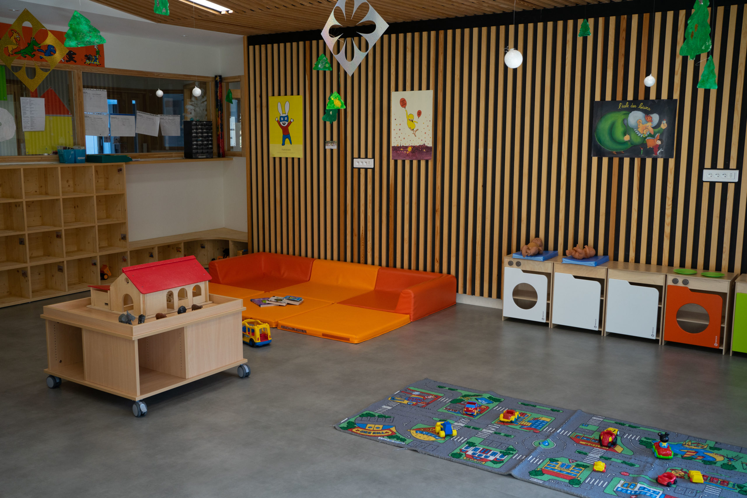 Nous avons deux espaces, un pour les petits/moyens et un pour les moyens/grands, avec du matériel adapté à l’âge des enfants.