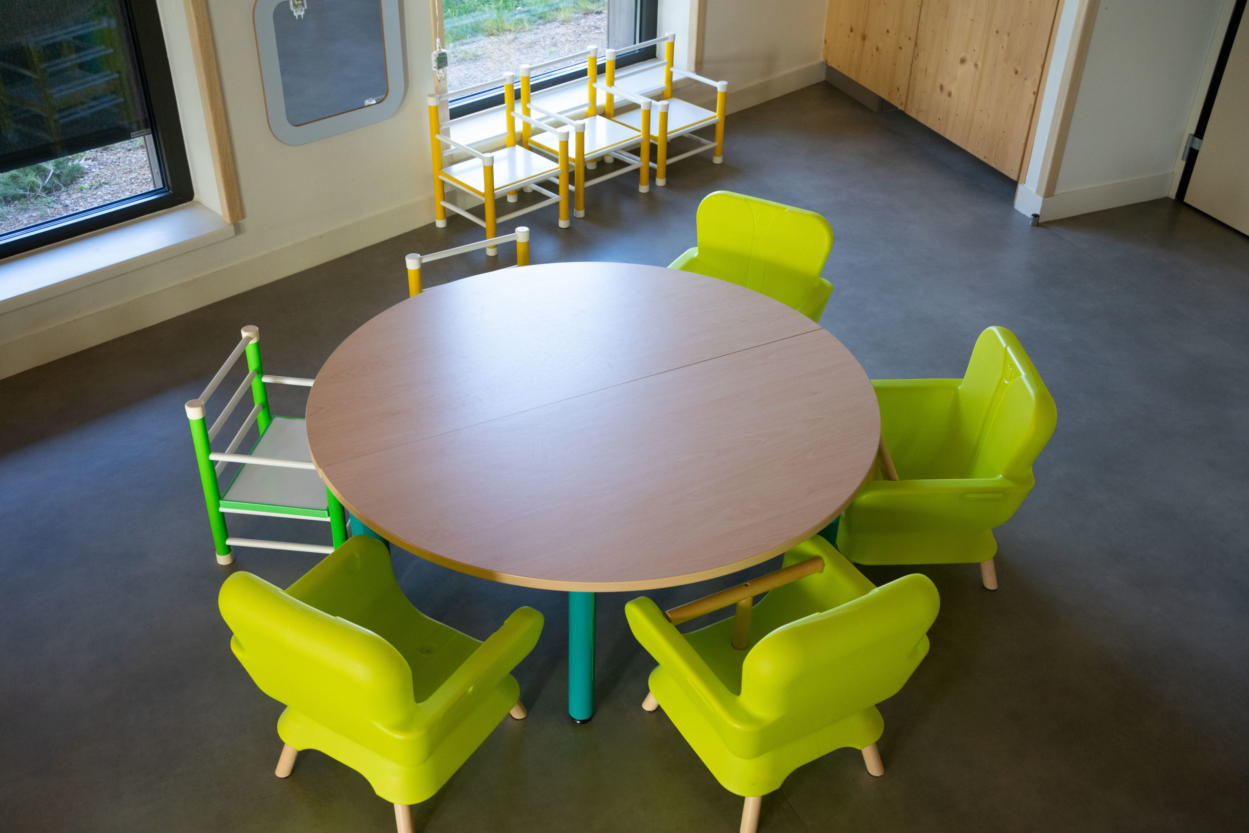 Cet espace est dédié aux repas et aux activités des moyens/grands avec un accès à une terasse pour profiter de l’extérieur à la belle saison.